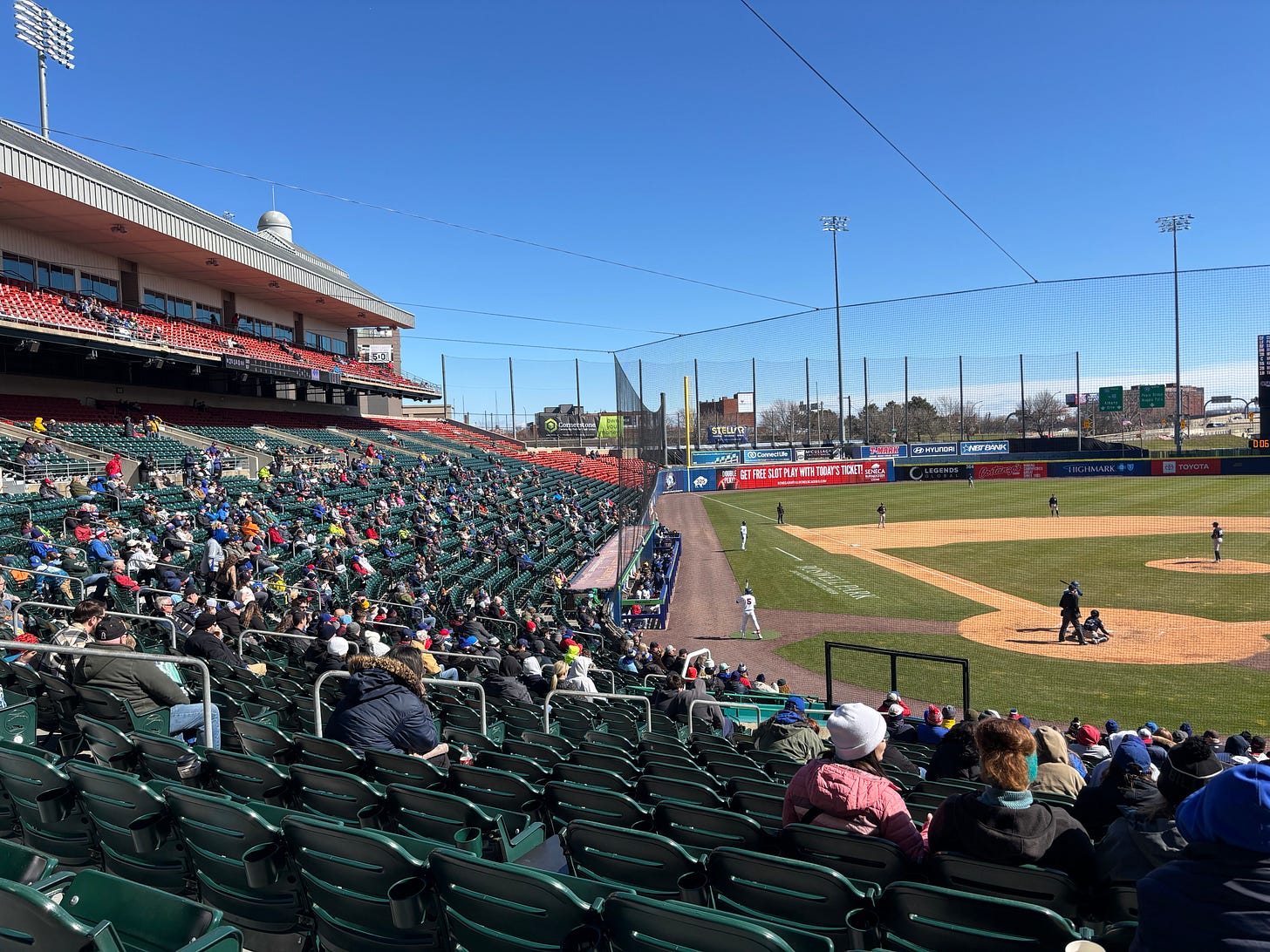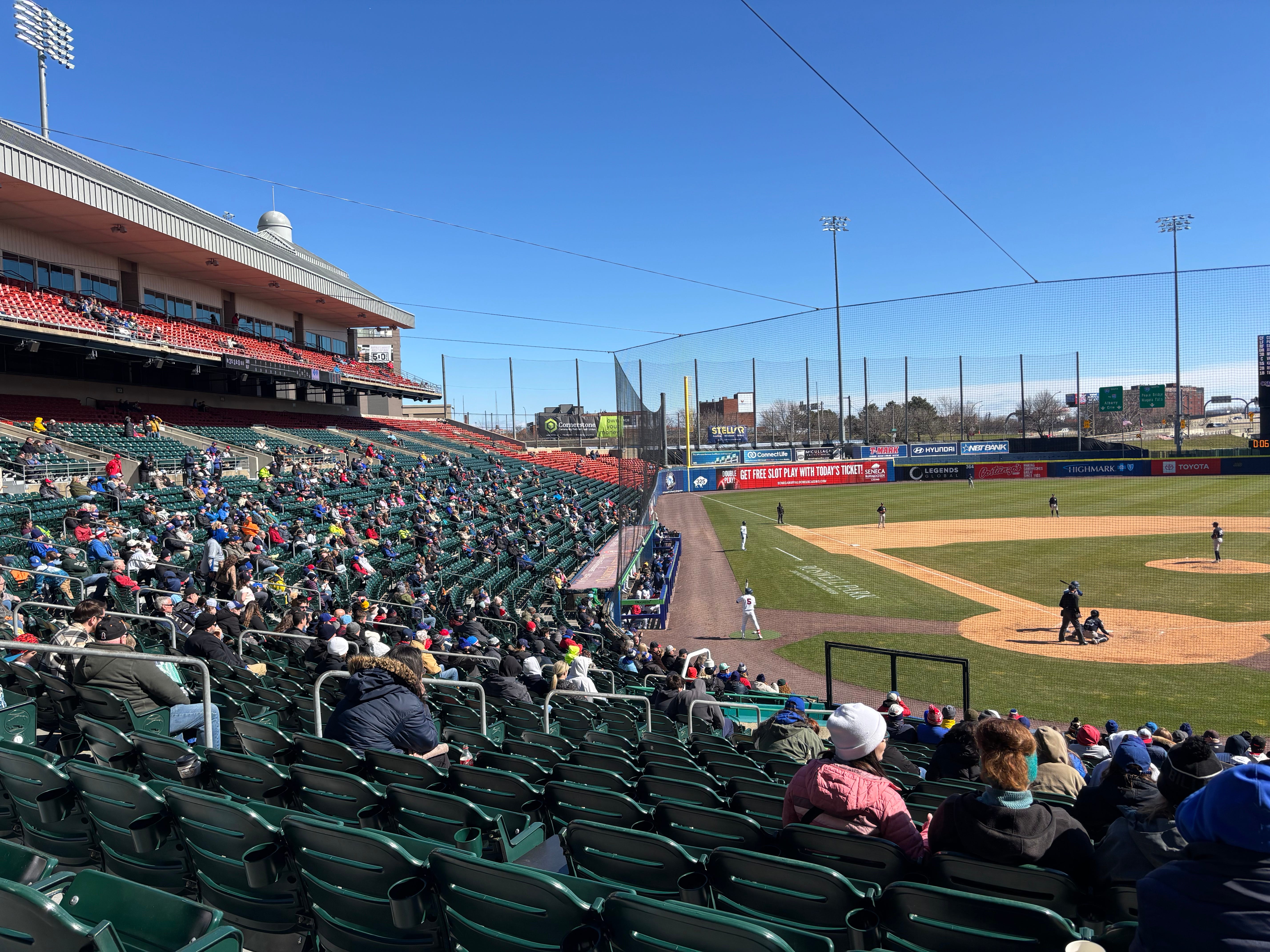 Friday, March 27, Sahlen Field : In the “You gotta want it bad,” category comes the third trip to our fair city—Opening Day for the Buffalo Bisons, our Triple-A baseball team. My pal Moe has had season tickets since before MLB passed over us for one of two National League franchises in 1992. (Denver and Miami became the two winners; who did we think we were?) He’s a sharing sort and invited me to Opening Day. Projected game time temperature at Sahlen Park, less than a mile from ice-covered Lake Erie, 31.5 degrees Fahrenheit. Hell, yes, I said. We are Western New Yorkers and baseball fans. Several thousand of us hardy souls bundled five and six clothing layers deep. Hey, it was four-dollar craft beer day at the stadium—what, you gonna pass that up? The sun was out, the wind minimal. The temperature rose to damn near 40 by the middle innings. And it was baseball season once again; life is good.