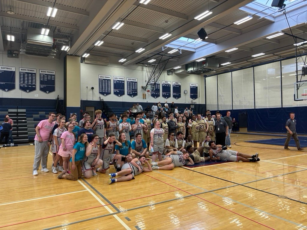 The Unified Club, under the leadership of EA alumna, now English teacher, Tara O’Connor Arnold ’08, began in 2022 by welcoming students with and without intellectual disabilities to a variety of activities at the high school. I first covered the club at a Unified basketball game, where three athletes, students with intellectual disabilities , and two partners, students without intellectual disabilities take the floor at a time. I had never witnessed such a display of sportsmanship. Basketball became simply a vehicle to express kindness and inclusion. At one point in the first game, an opposing athlete shot and missed. The Blue Devil player who rebounded the ball, rather than taking off for his end of the court, handed the ball to the opponent, cleared a path for her and let her shoot again. She made the second shot, both benches and the crowd erupted in cheers. High fives for everyone. And I wept, just a little. But I wept for her, for the East Aurora and opposing players, for all of us.