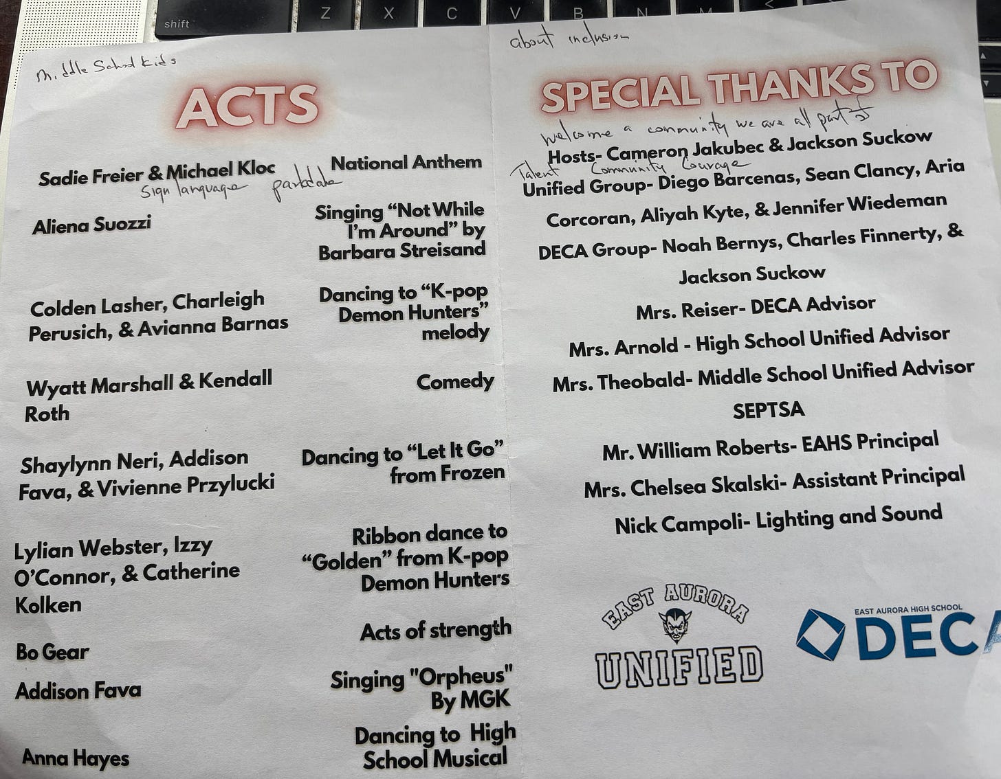 A student I have gotten to know over the last few years, senior Sadie Freier, and her sidekick, junior Michael Kloc, proudly took the stage at the first (perhaps annual) Unified Club Talent Show and knocked the national anthem out of the park. Sadie, resplendent in a scarlet gown, without prompting or without a song sheet, belted out the tune, reaching its high notes and lows with ease while Michael, in a blue tunic, gave his interpretation of the song through expressive hand and body movements. They were wonderful. I’m not sure if anyone else was crying; I couldn’t focus through my own tears.